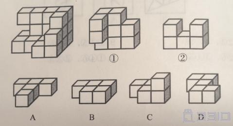 下图①由9个小立方体构成,可由立体图形②、③和④组合而成,下列哪一项不能填人问号处?