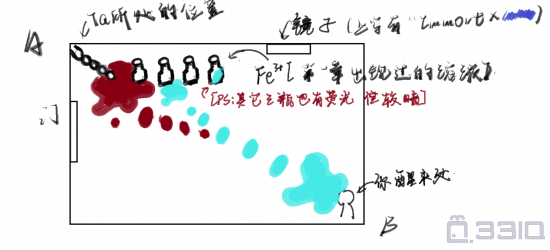 2、图中蓝色的是鲁米诺反应发出的荧光,显示了被抹去的血迹(按理来说A处血迹也应该发光但是为了方便看画成了红色)