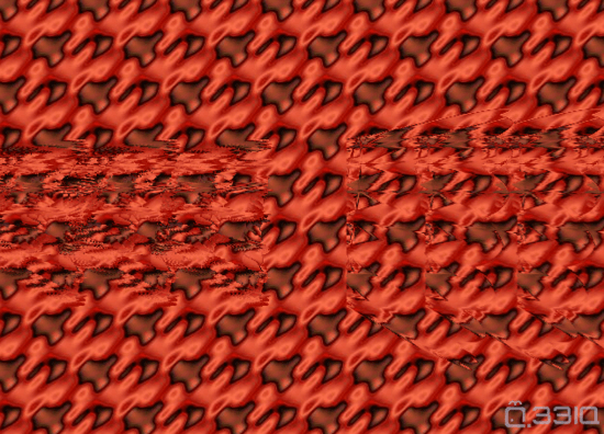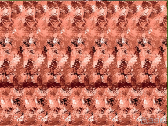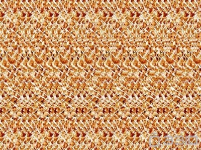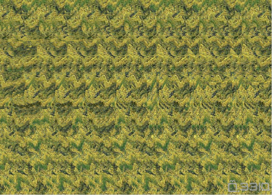 20世纪70年代,Smith-Kettlewell眼科研究所的Christopher Tyler设计了更加有趣的自动立体图(autostereograms)。我们可以通过平行眼(或者交叉眼:左眼看右边、右眼看左边),用两只眼睛分别盯着图案的一部分来观看这些包含重复图案的壁纸。想要看到图中3D物体的一个简单方法是:先放松眼睛肌肉,使左眼看到左上方的点、右眼看到右上方的点;然后慢慢地调整视角,当你能在图像的顶部看到三个点后,再慢慢地调整眼睛焦距,你将会看到图像里面的3D物体。这时,轻微地晃动脑袋有助于确定物体的边缘。你看到什么了吗?