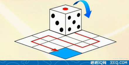 问当骰子按轨迹滚动到蓝色区域时,上方的数字是什么?