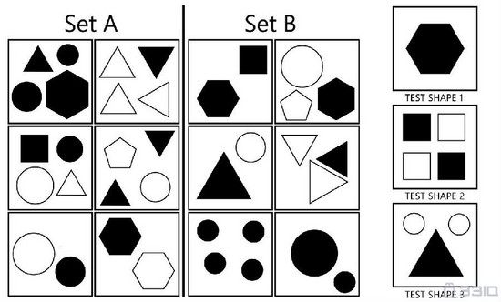 圖形歸類問題,A類圖和B類圖有著不同的性質,歸納兩者的區別,並把右邊的三幅圖進行分類,要麼屬於A類圖要麼屬於B類圖。
