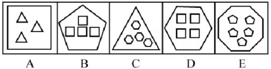 在上边的题干中给出一套图形,其中有五个图,这五个图呈现一定的规律性。在下边给出一套图形,其中有四个图,从中选出唯一的一项作为保持左边五个图规律性的第六个图。
