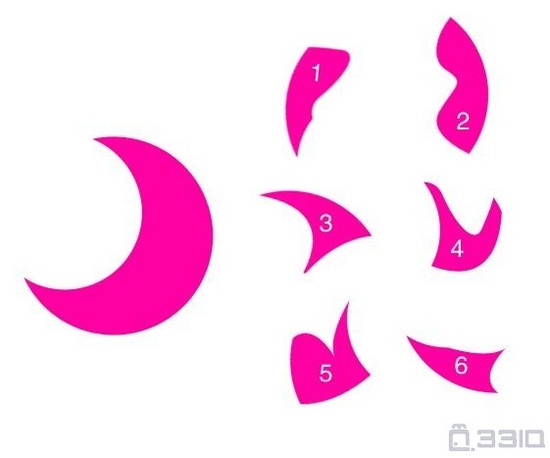 下图的月亮被分割了成了5块(可旋转、不可翻转)。你能从六个碎片中挑出5个来组成一个完整月亮吗?