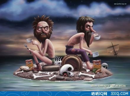 荒岛余生,一无所有,夜黑风高,各执刀叉,目露凶光,谁敢睡觉?这就是你最需要Taina咖啡的时候。考考你,你觉得那句话最能突出该海报的主题?