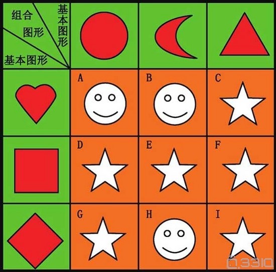 在4×4表格中,第一行有3个基本图形,第一列也有3个基本图形,行与列对应的图形按照某一规律复合,构成了中间9个图形。但是中间有一个图形的复合是不符合对应规律的,请把它找出来。